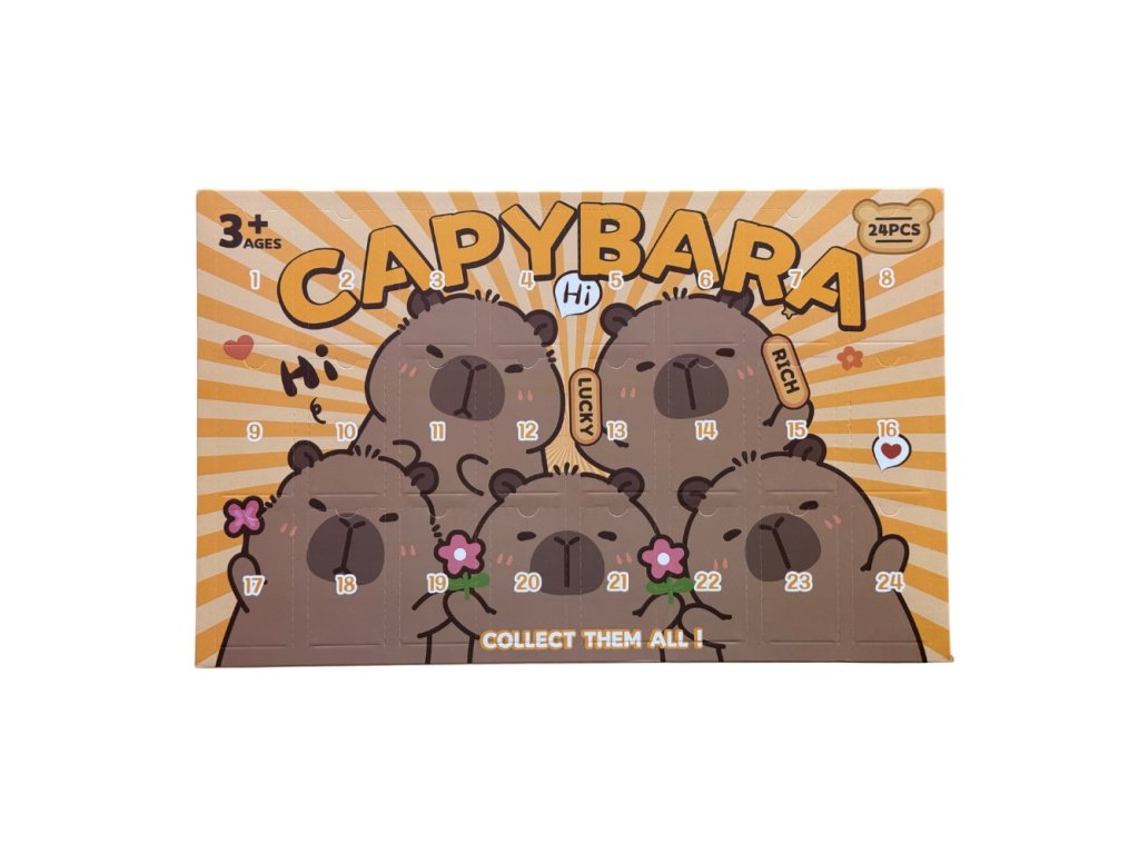 Adventný kalendár Kapybara s 24 veselými figúrkami, ktoré potešia deti aj dospelých každý deň pred Vianocami. Otvorte každý deň nové prekvapenie s týmto jedinečným adventným kalendárom plným veselých figúrok kapybar.