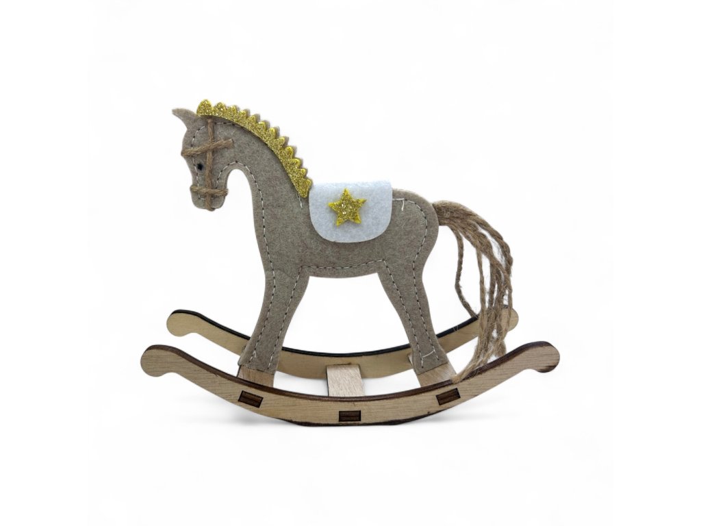 Tento kúzelný hojdací kôň z plsti ako dekorácia na postavenie pripomína skoršie doby a aj v dnešnej dobe upúta pozornosť. Dekoráciu môžete ozdobiť vianočnými vetvičkami a vianočnými guľami a zaručene sa bude dobre vynímať napríklad na komode alebo príborníku.