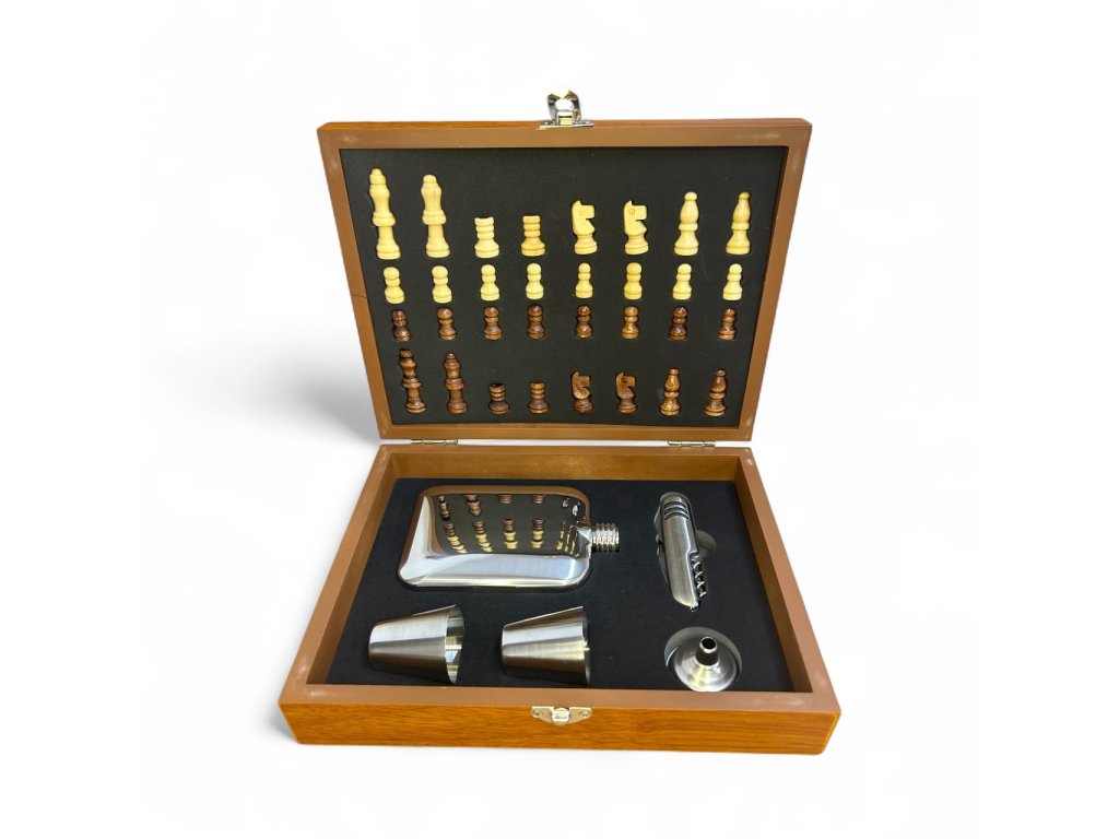 Darčekový set ploskačka s panákmi a vreckovým nožíkom + šachy